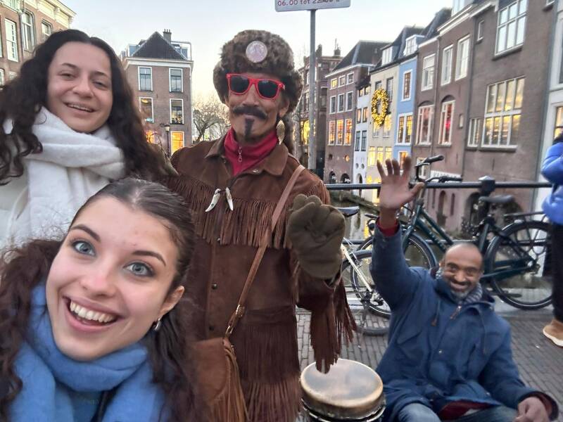 2025-12-13, zaterdag (bij de Dom): v.l.n.r. > Sylvia, Bob, ik, drummer!