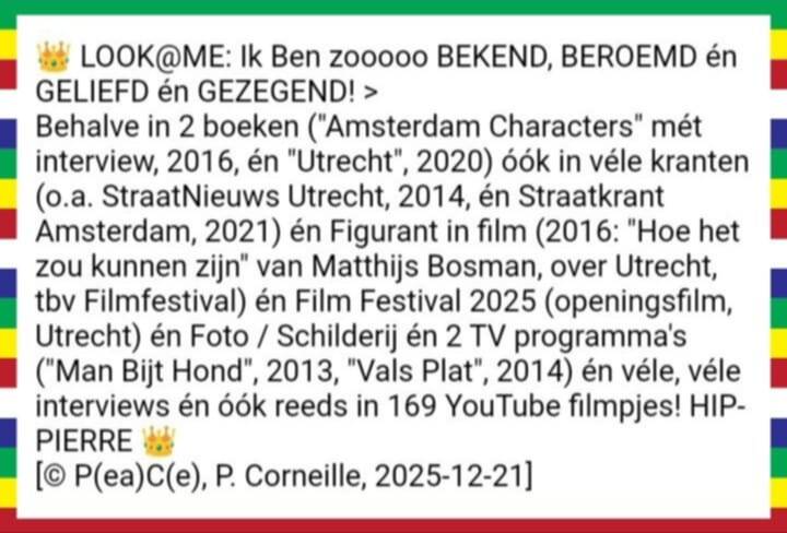 👑 Onsterfelijk!: Al 27x geïnterviewd (o.a. 2 straatkranten), op 170 YouTube filmpjes, in 1 film, in 2 boeken, in 2 TV-programma's, op ingelijste poster in Surinaams restaurant, poster Woetstok Wageningen, figurant in film, Film Festival 2025 > Bekend & Beroemd! 👑