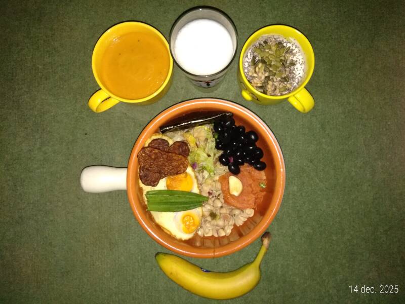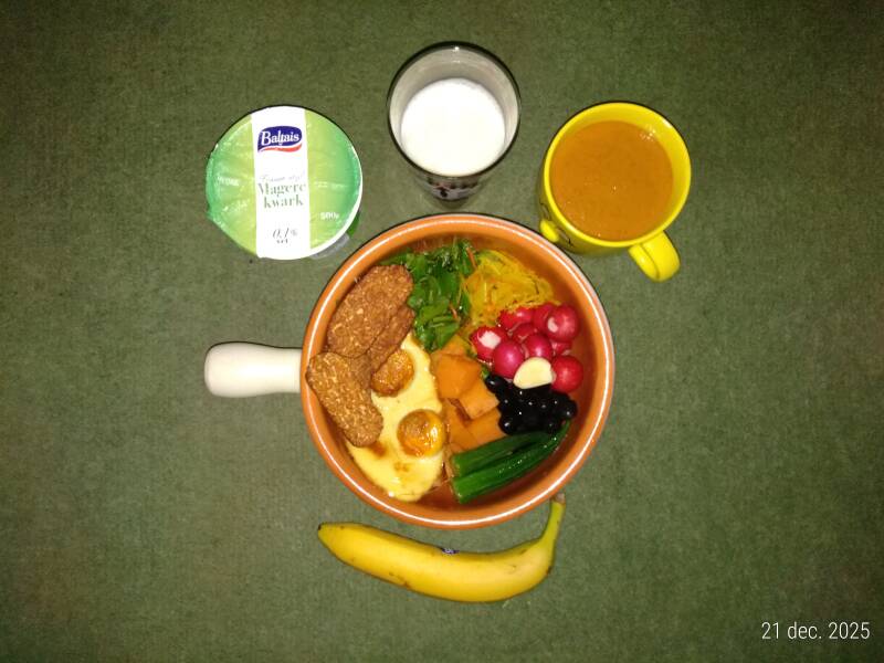 1. Hoofdmaaltijd: atjar tjampoer, 2 gebakken eitjes, 2 okra, 22 olijven, 11 radijsjes, 5 tempeh, waterkers mét olijfolie en geraspte parrano kaas, zoete aardappelen!