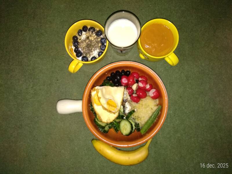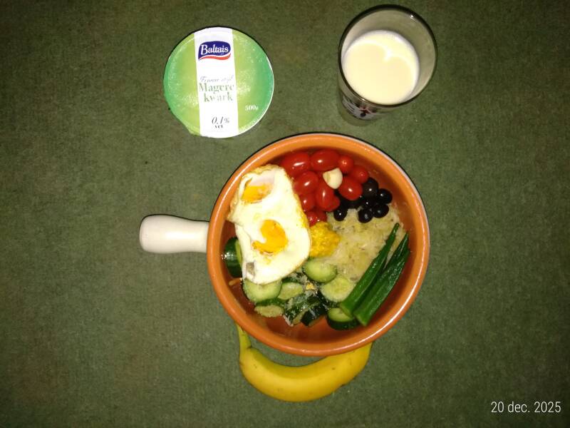 1. Hoofdmaaltijd: komkommer in olijfolie én Parrano kaas, mét 2 gebakken eitjes, 1 knoflook, 21 olijven, 1 okra, 11 radijsjes, 1 sardientje, zuurkool!